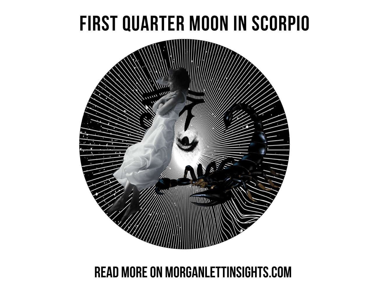 The First Quarter Moon occurs in misty Scorpio. This FQM is deep, intense, and sensual. It tickles our most sensitive soft spots so that we can peacefully move through them to build a sturdy foundation on solid ground. Relationships and shared resources are highlighted under this waxing moon. It foreshadows sporadic group ventures, testy joint investments, and outlandish community healing.